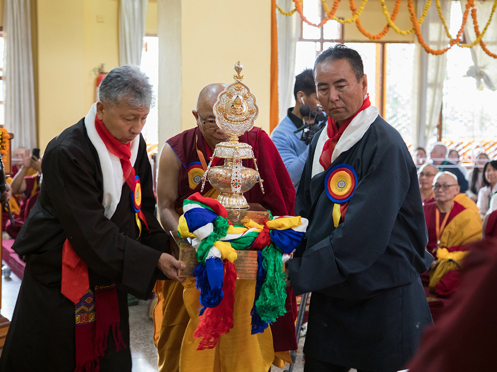 ༈ བོད་རྒྱལ་ལོ་༢༡༤༦ ཕྱི་ལོ་༢༠༡༩ ལོར་ཁམས་གསུམ་འགྲོ་བའི་བླ་མ་ཤར་རྒྱལ་བ་ཙོང་ཁ་པ་ཆེན་པོའི་ཞལ་སྔ་ནས་ཀྱིས་བར་དོ་ལོངས་སྤྱོད་རྫོགས་པའི་སྐུ་མངོན་དུ་མཛད་པ་དང་། རྗེ་ཉིད་ཀྱིས་རྒྱུད་ཆེན་ཤེས་རབ་སེངྒེར་རྒྱུད་ཀྱི་གླེགས་བམ་གནང་སྟེ་གསང་སྔགས་ཀྱི་བསྟན་པའི་བདག་པོར་མངའ་གསོལ་མཛད་པ། རྒྱུད་ཆེན་ཀུན་དགའ་དོན་གྲུབ་དཔལ་བཟང་པོ་མཆོག་ངོ་མཚར་སྐུ་ཡི་མཚན་དཔེའི་དཀྱིལ་འཁོར་བཞད་ནས་ལོ་ངོ་དྲུག་བརྒྱ་ཐམ་པ་འཁོར་བ་བཅས། དུས་ཆེན་སུམ་འཛོམས་ཀྱི་རྒྱུད་ཆེན་རྗེས་དྲན་གྱི་དུས་སྟོན་སྐབས། ལྷར་བཅས་འགྲོ་བ་ཡོངས་ཀྱི་གཙུག་རྒྱན་༸སྤྱི་ནོར་༸གོང་ས་༸སྐྱབས་མགོན་ཆེན་པོ་མཆོག་གི་ཞབས་ཟུང་གསེར་གྱི་འཁོར་ལོ་མཛད་སྒོའི་ཚོགས་མགོན་དུ་མངོན་པར་བཀོད་ཅིང་། རྒྱུད་ཆེན་རྗེས་དྲན་ཆེན་མོའི་གསང་སྔགས་མཁས་པའི་བགྲོ་གླེང་གི་དབུ་བཞུགས་བཀའ་དྲིན་ཆེ་བ་མ་ཟད། དཔལ་ལྡན་སྟོད་རྒྱུད་གྲྭ་ཚང་གི་མཁན་བླ་འདུས་མང་ཡོངས་དང་། དད་དམ་ལྷག་བསམ་གཡོ་བ་མེད་པའི་རྒྱུད་ཟུར་རྣམས་ཀྱིས་ཇི་ལྟར་གསོལ་བ་བཏབ་པ་བཞིན་ཚེ་རབས་དུ་མར་བསགས་པའི་རྣམ་དཀར་གྱི་འབྲས་བཟང་དུས་སུ་སྨིན་པ་ལས། ༸མགོན་པོ་གང་ཉིད་ཀྱི་སྐུ་ཚེ་ཞབས་པད་རྡོ་རྗེའི་ཁམས་སུ་བརྟན་ཅིང་། རླབས་ཆེན་ཐུགས་ཀྱི་བཞེད་དགོངས་མཐའ་དག་ལྷུན་གྱིས་འགྲུབ་པའི་ཕྱིར་དུ་བརྟན་བཞུགས་བསྟར་འབུལ་ཞིབ་རྒྱས་དང་འབྲེལ། རྟེན་འབྲེལ་དང་དགོས་པ་ཁྱད་པར་ཅན་དུ་མ་ལ་དམིགས་ཏེ་གྲྭ་ཚང་གི་མཁན་བླ་འདུས་མང་ཡོངས་ནས་རིན་ཆེན་གཉིས་པ་ལས་གྲུབ་པའི་ཆོས་ཀྱི་འཁོར་ལོ་རྡོར་དྲིལ་དང་ཆོས་དུང་གིས་བརྒྱན་པ་དང་། རྒྱུད་ཟུར་མཐུན་འབྲེལ་ཚོགས་པ་ནས་རིན་ཆེན་གཉིས་པ་ལས་གྲུབ་པའི་ཚེ་བུམ་དཔག་བསམ་གྱི་ཤིང་དང་ཚེ་དཔག་མེད་ཀྱི་སྣང་བརྙན་དུང་དཀར་གྱིས་བརྒྱན་པ་བཅས་༼ བཀའ་དྲིན་རྗེས་དྲན་གྱི་མཚོན་རྟགས་ ༽ སུ་འབུལ་རྒྱུའི་སྲིད་ན་རྙེད་དཀའི་སྐལ་བཟང་གི་དུས་སྟོན་མངོན་པར་ཤར།