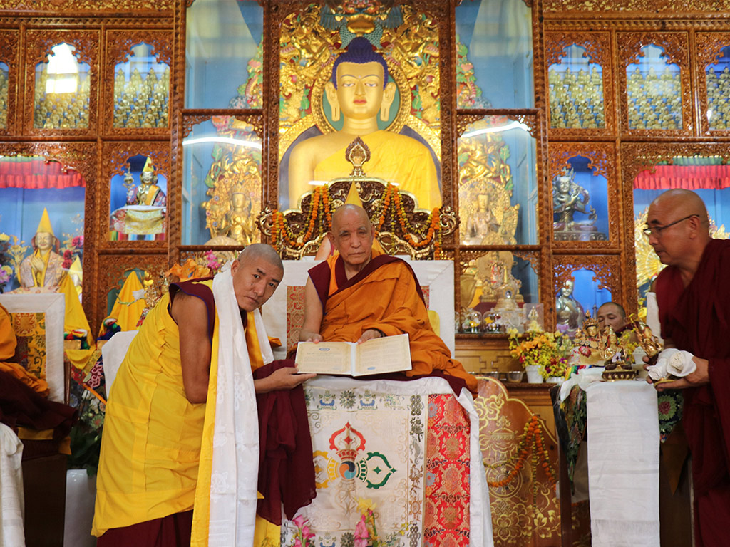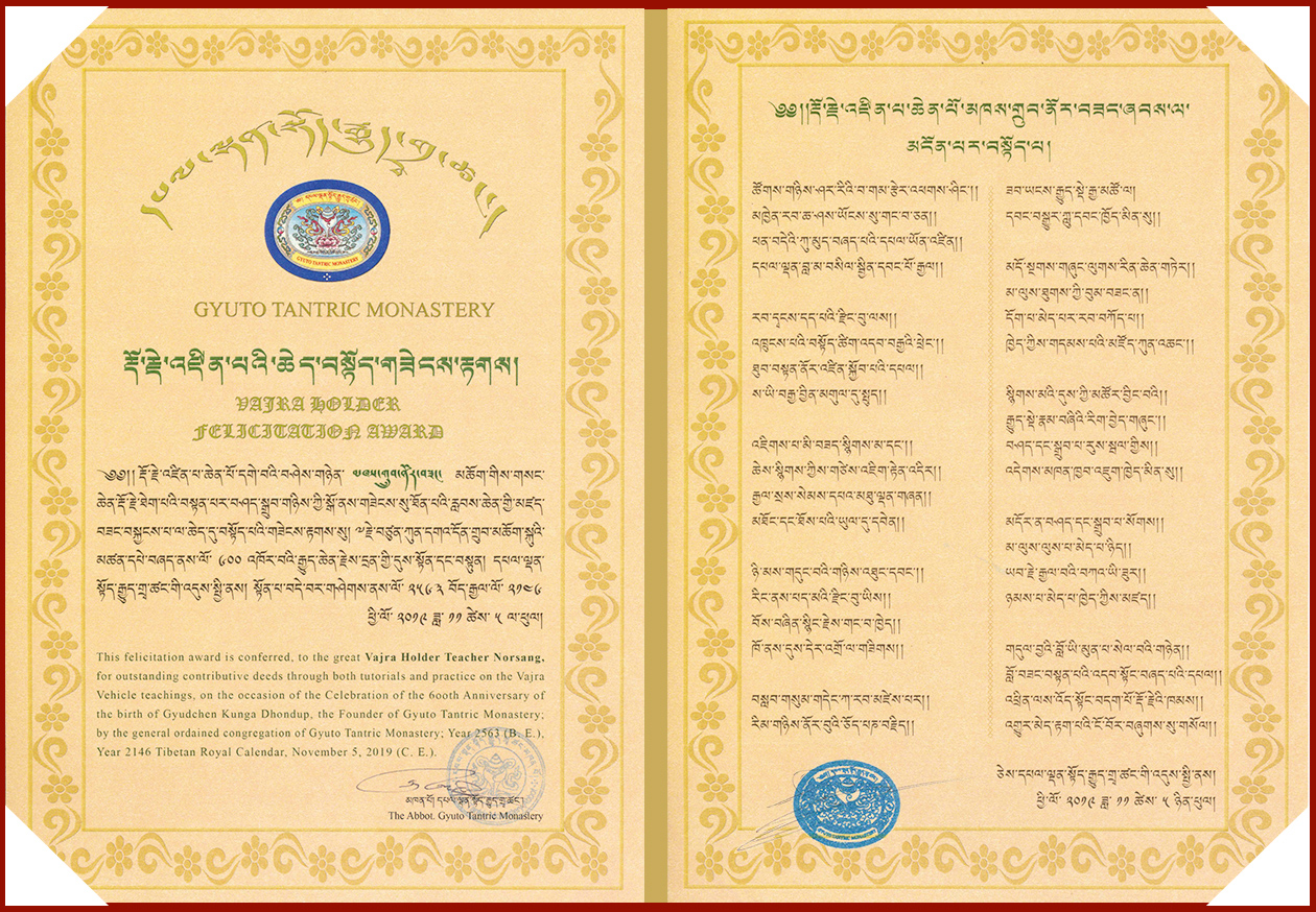 ༄༅།། བོད་རྒྱལ་ལོ་ ༢༡༤༦ ཕྱི་ལོ་༢༠༡༩ ལོར་དུས་ཆེན་སུམ་འཛོམས་ཀྱི་དྲུག་བརྒྱའི་རྒྱུད་ཆེན་རྗེས་དྲན་ཆེན་མོའི་གསང་སྔགས་མཁས་པའི་བགྲོ་གླེང་སྐབས་མཁས་བཙུན་བཟང་གསུམ་གྱི་བདག་ཉིད་དགེ་བའི་བཤེས་གཉེན་ཆེན་པོ་མཁས་གྲུབ་ནོར་བཟང་མཆོག་དང་། དགེ་བའི་བཤེས་གཉེན་ཆེན་པོ་བློ་བཟང་འབྲུག་གྲགས་རྣམ་གཉིས་ཀྱིས་ལོ་མང་རིང་ཐུགས་ངལ་འཛེམས་མེད་ཀྱིས་གསང་ཆེན་རྒྱུད་གྲྭ་སྟོད་སྨད་གཉིས་ཀྱི་བསྐྱེད་རིམ་པ་དང་། གདན་ས་ཁག་ནས་ཕེབས་པའི་ཆོས་ཐོག་དགེ་བཤེས། དེ་བཞིན་དོན་གཉེར་ཅན་རྣམས་ལ་འཇམ་མགོན་བླ་མ་ཙོང་ཁ་པ་ཆེན་པོའི་གསུང་གི་ཉིང་ཁུ་ཟབ་གསང་རྡེ་རྗེ་ཐེག་པའི་ཡང་རྩེ། ས་གསུམ་གྱི་སྒྲོན་མེ་ལྟ་བུའི་ལེགས་བཤད་རྨད་དུ་བྱུང་བ་སྔགས་རིམ་ཆེན་མོ་དང་། རིམ་ལྔ་གསལ་སྒྲོན་སོགས་དང་། དེ་བཞིན་རྒྱུད་ཆེན་རྡོ་རྗེ་འཆང་ཡབ་སྲས་རྣམ་གཉིས་ཀྱི་རྒྱུད་ཊཱིཀ་ཆེན་མོ་སོགས་ཀྱི་དཔེ་ཁྲིད་དང་བཤད་ལུང་གི་རྒྱུན་བཟང་སྤེལ་བ་དང་། དེ་དང་ཕྱོགས་མཚུངས་དཔལ་མཉམ་མེད་རི་བོ་དགེ་ལྡན་པའི་ཟབ་གསང་སྔགས་ཀྱི་དབང་ལུང་མན་ངག་གི་རྒྱུན་དཀོན་རིགས་རྣམས་བཙལ་འཚོལ་གྱིས་ཐུགས་དམ་ཉམས་བཞེས་དང་འབྲེལ། སྐལ་བ་དང་ལྡན་པའི་དོན་གཉེར་ཅན་རྣམས་ལ་བཤད་ཁྲིད་དང་མན་ངག་བདུད་རྩིའི་རྒྱུན་བཟང་དུས་ནས་དུས་སུ་སྤེལ་བཞིན་པ་སྟེ། རྗེ་བླ་མའི་གསང་ཆེན་རྡོ་རྗེ་ཐེག་པའི་བསྟན་པ་རིན་པོ་ཆེའི་འཕྲིན་ལས་ཀྱི་འཇུག་པ་དུས་ཀྱི་མཐར་ཡང་མི་ཉམས་པར་གནས་པའི་རྨད་དུ་བྱུང་བའི་མཛད་བཟང་བསྐྱངས་པར་བརྟེན། གྲྭ་ཚང་རིན་པོ་ཆེ་ནས་མཛད་བཟང་ཤེས་པའི་ཡི་རང་བསྔགས་བརྗོད་དང་འབྲེལ་མཚན་དོན་མཐུན་པའི་༼ རྡོ་རྗེ་འཛིན་པའི་ཆེད་བསྟོད་གཟེངས་རྟགས་ ༽ ཞེས་པ་དེ་ཉིད། ཕྱི་ལོ་༢༠༡༩ ཟླ་༡༡ ཚེས་ ༥ ཉིན་༸འཇམ་མགོན་རྒྱལ་བའི་གདུང་འཚོབ་དགའ་ལྡན་ཁྲི་ཆེན་བརྒྱ་དང་བཞི་པ་རྗེ་བཙུན་བློ་བཟང་བསྟན་འཛིན་མཆོག་གིས་དགྱེས་སྩོལ་གནང་བཞིན་པའི་རྣམ་པ།